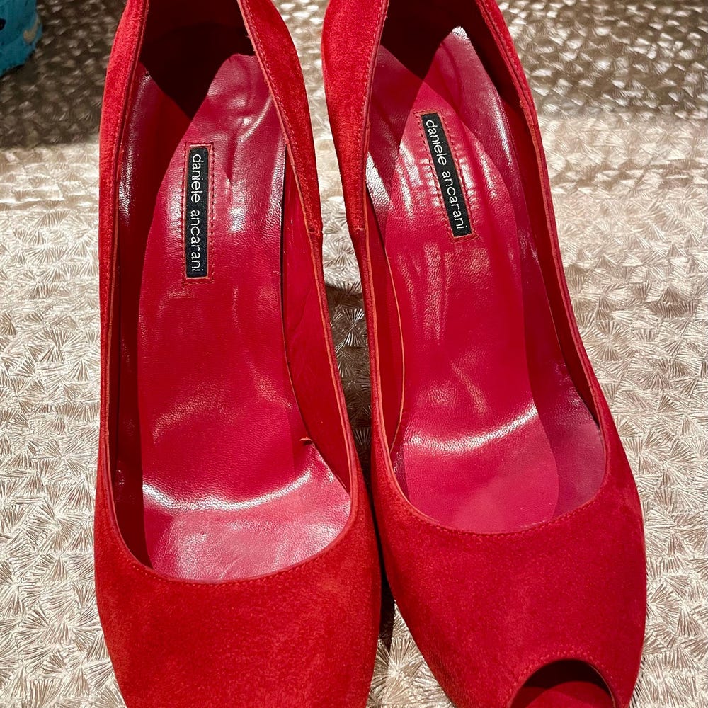 Gorgeous Red Suede & Leather Vintage Daniele Ancarani 4 inch High heeled Shoes, Size 40, Made in Spain.