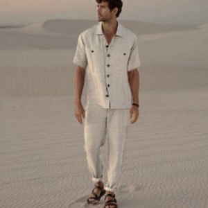 Mens linen loungewear two piece set / Custom ecru off white linen pant and shirt button up suit / Mens short sleeve shirt & pant set