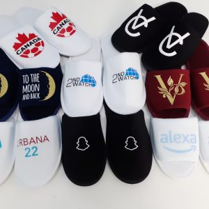 Personalized hotel slippers with your custom small business logo (corporate gifts), branded slippers for employee gifts, open houses, etc.